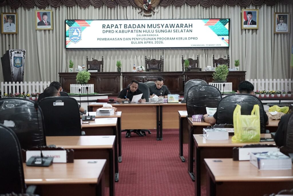 HULU SUNGAI SELATAN – Badan Musyawarah (Banmus) DPRD Kabupaten Hulu Sungai Selatan (HSS), menggelar rapat pembahasan dan penyusunan program kerja DPRD untuk bulan April 2026, Rabu (25/3/2026).