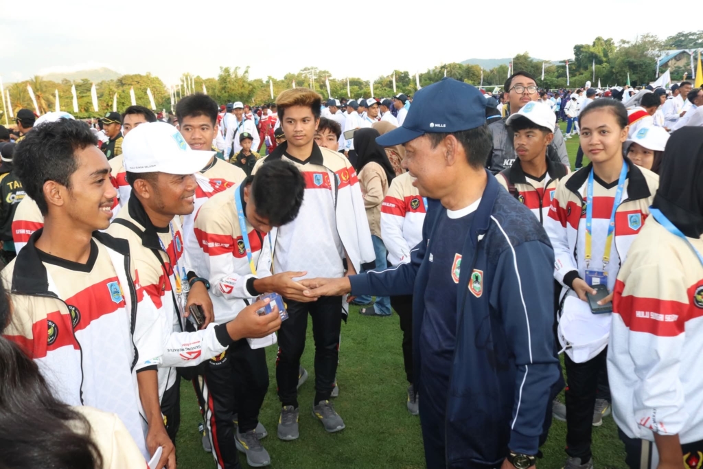 Setelah seremonial pembukaan, Wabup HSS Suriani langsung turun dari tribun undangan, dan memberikan dukungan penuh kepada para atlet HSS yang hadir dalam pawai kontingen.