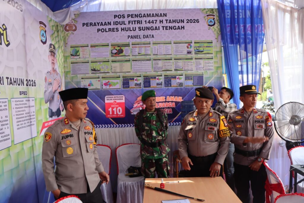 HULU SUNGAI TENGAH – Kapolres Hulu Sungai Tengah AKBP Jupri JHP Tampubolon dan Ketua Bhayangkari Cabang HST, melakukan pengecekan terhadap Pos Pengamanan dan Pos Pelayanan Idulfitri 1447 Hijriah, Jumat (13/3/2026).