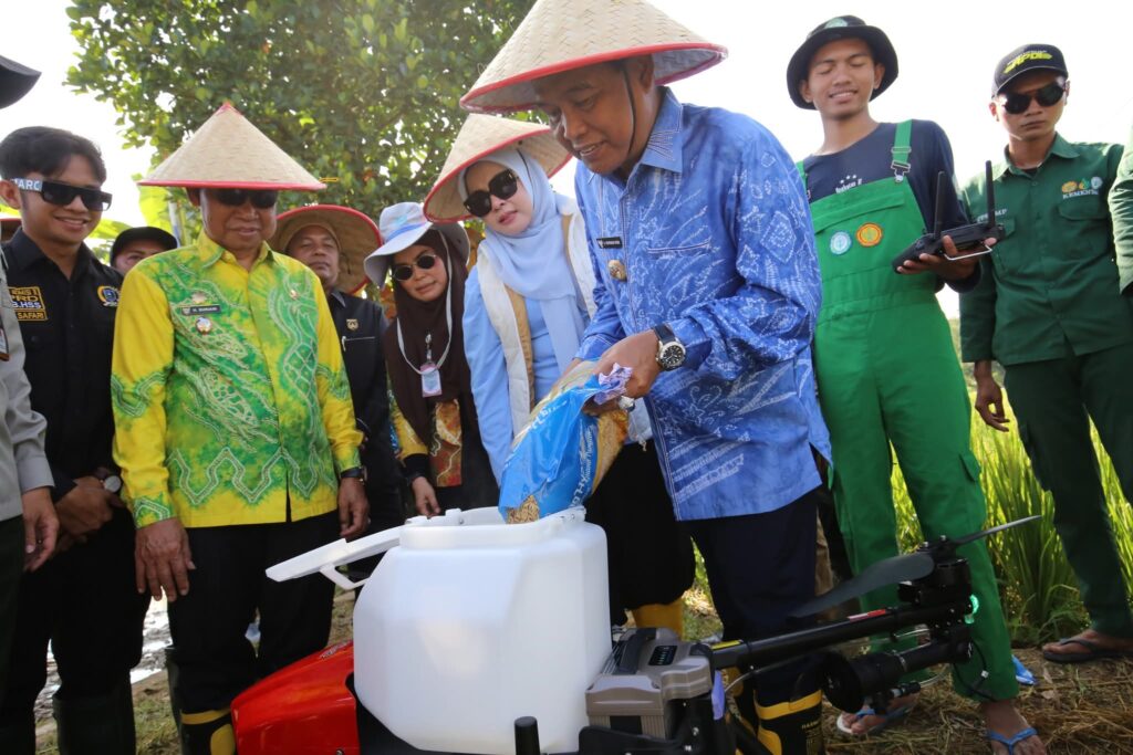Bupati HSS Syafrudin Noor, mengoperasionalkan drone pertanian, untuk melaksanakan tanam padi tersebut.