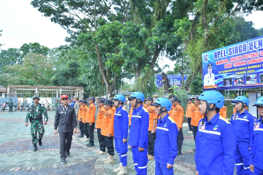 Barisan peserta apel terdiri personel TNI, Polri, Satpol PP dan Damkar, BPBD HSS, Tagana, serta berbagai unsur relawan kebencanaan.