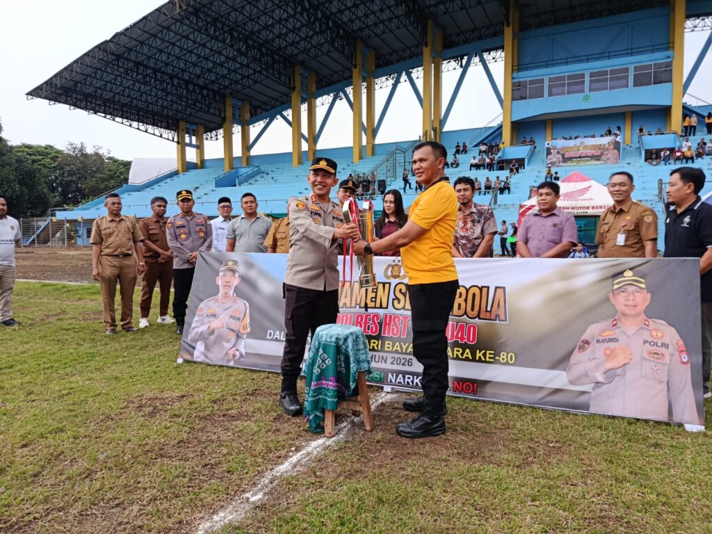 Kapolres HST juga menyampaikan apresiasi setinggi-tingginya kepada Pemerintah Kabupaten HST, Askab PSSI, panitia, serta seluruh elemen masyarakat yang telah mendukung suksesnya acara ini.